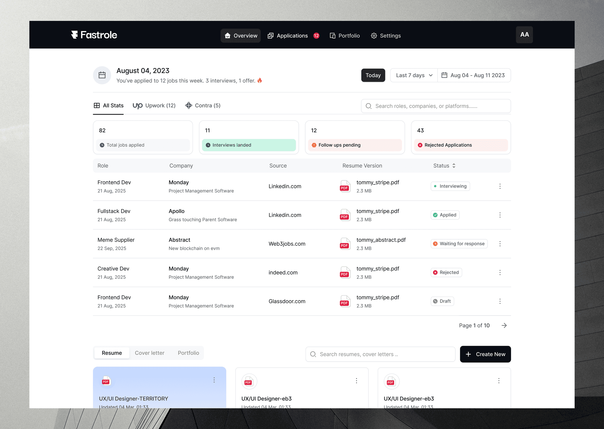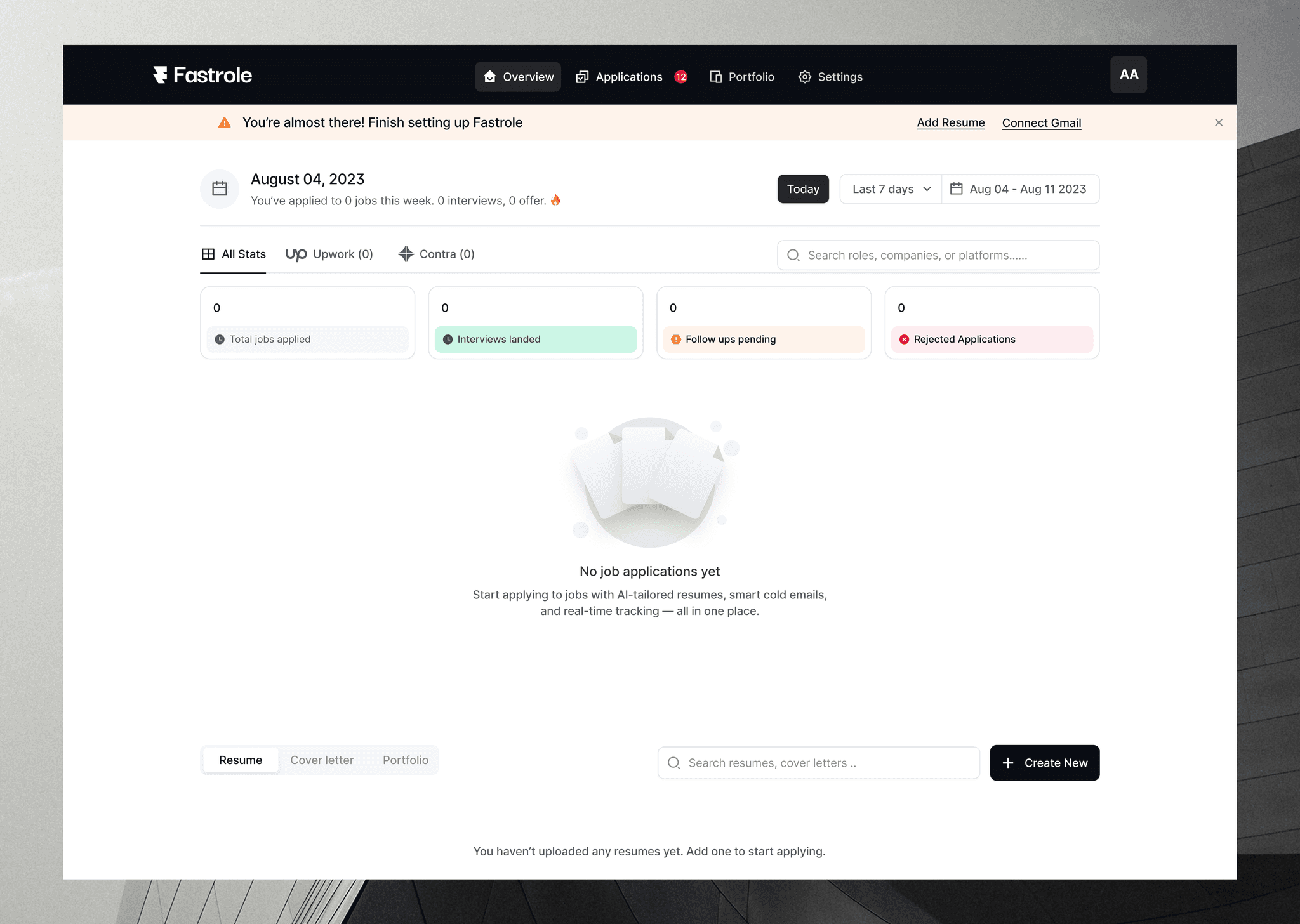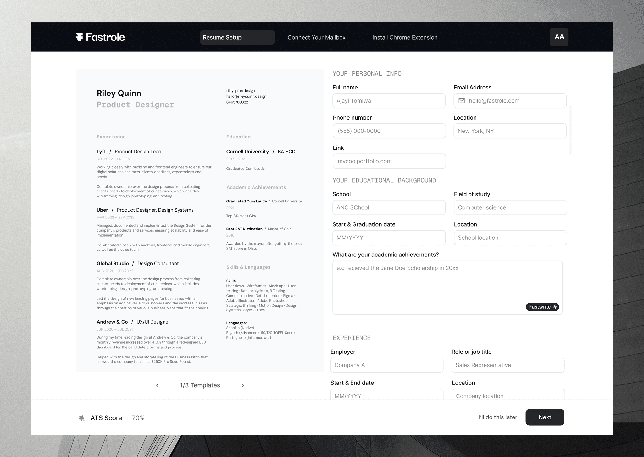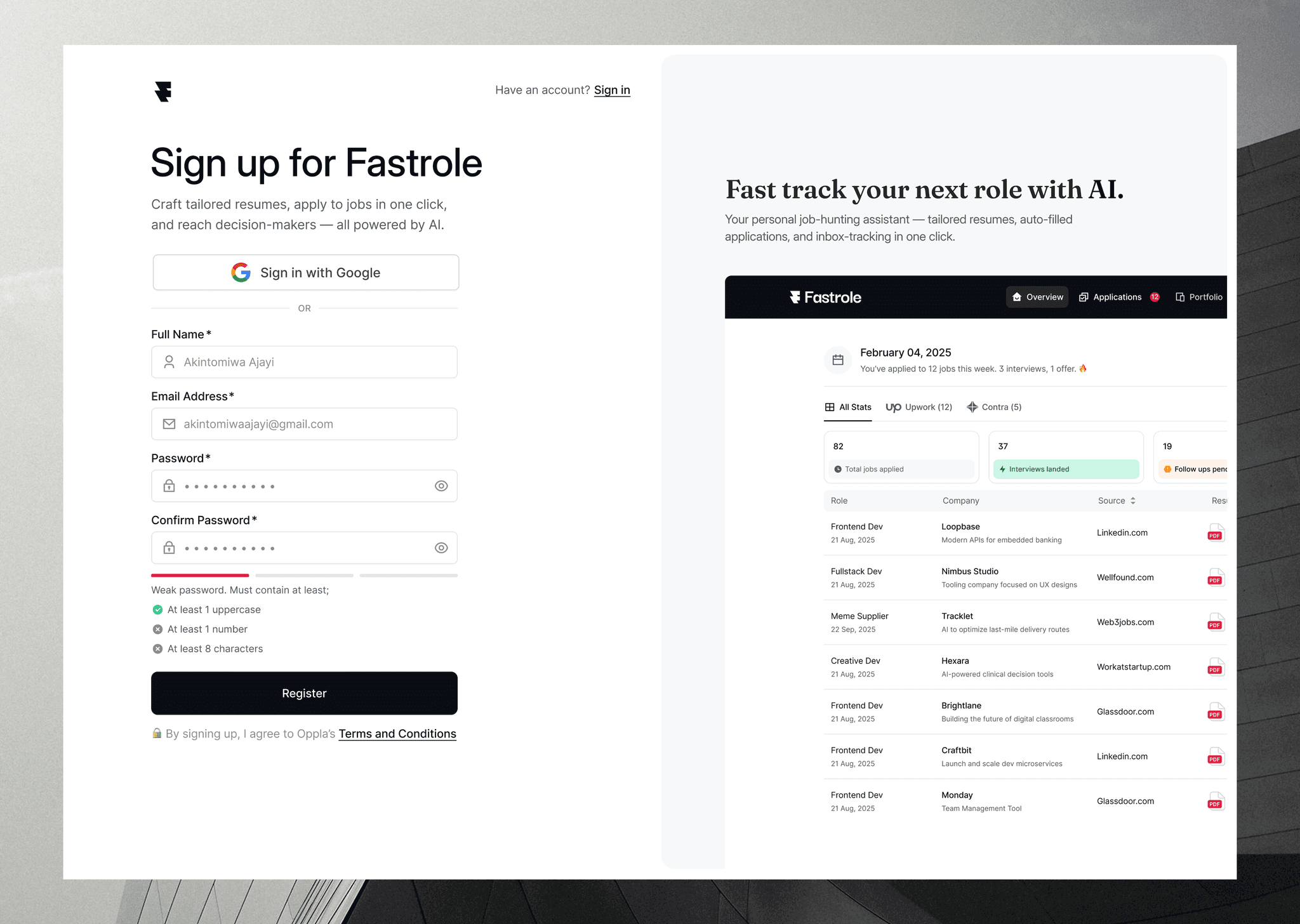 Fastrole is a personal job-hunting assistant designed to remove the repetitive, manual work involved in applying for jobs. Instead of asking users to upload a resume and start applying manually, Fastrole structures their career data during onboarding, connects to their mailbox, and installs a browser extension that can automatically fill job applications across platforms. Every application, response, and resume version is then tracked inside a single dashboard.